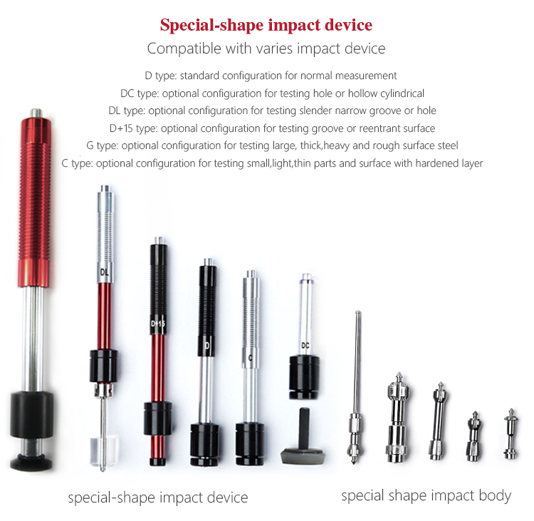 | Portable hardness tester G type impact device, height: 255mm Weight: 250g Diameter: 30mm. Built-in G-type impact device, G-type impact body and G-type ball is larger than the other impact body, the impact force is about 9 times of the D-type ball. the impact is heavier, has low requirement to the surface . Applied to the casting and forging with weight of more than 15kg, the thickness of 10mm or more, more than 1.2mm hardened layer, larger and rougher surface. Main applications:car chassis hardness testing;the installed machinery and permanently assembled parts;rapid testing in large range and multi-measuring areas for large-scale work piece;failure analysis of pressure vessel, steam generator and other equipment;bearings and other parts;material identification in the warehouse of metallic materials;heat treatment workpiece of quality control; It can realize the precise measurements of Leeb, Brinell, Rockwell and others. |