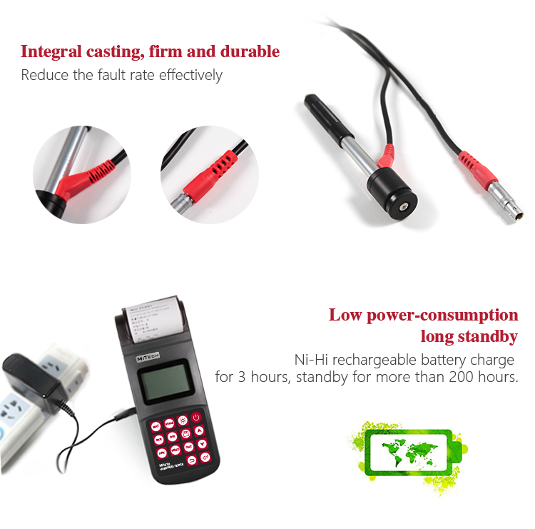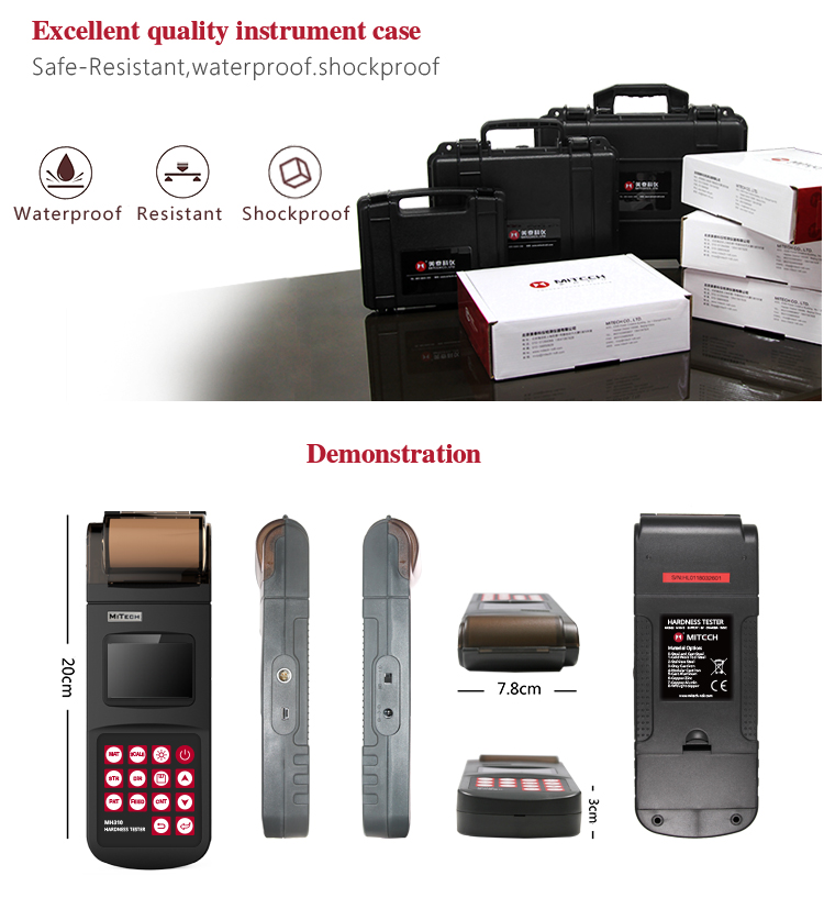 Product OverviewMH310 portable Leeb hardness tester, based on Leeb hardness measuring principle, quick and easy on-site test the hardness of series metal materials, support free conversion between Leeb, Brinell, Rockwell hardness scale and others,It uses high-contrast segment LCD to display clear ,stable performance. integrated high-speed thermal printer ,which can print on-site measurements. It is widely used in annealing, tempering, quenching , quality control for the work piece; hardness testing for machine tool and automobile chassis ; on-site hardness testing of in-service non-removable parts ; quality testing for hardware, forging, machine tools and special steels; quality control for batch production process and so on.Good quality and effective cost ,which is a wise choice for regular need of hardness testing .