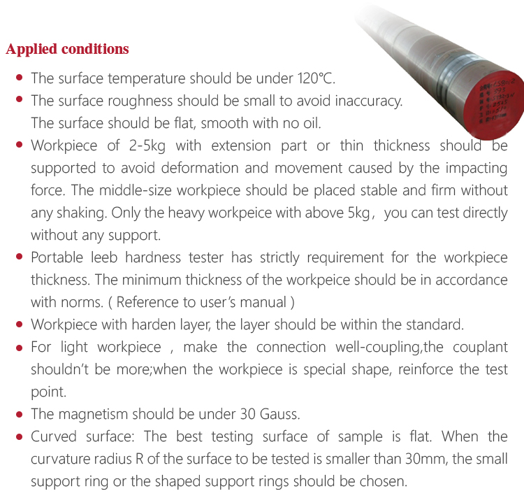 ---- If want accurate conversion from the Leeb hardness value to other hardness value, contrastive test is needed to get conversion relations for the special material. Use inspection qualified Leeb hardness tester and corresponding hardness tester to test at the same sample respectively. For each hardness value, each measure homogeneously 5 points of Leeb hardness value in the surrounding of more than three indentations which need conversion hardness, using Leeb hardness arithmetic average value and corresponding hardness average value as correlative value respectively, make individual hardness contrastive curve. Contrastive curve at least should include three group of correlative data.