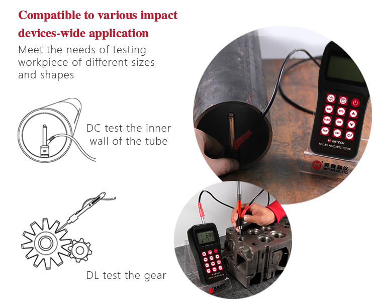 | The DL type impact device of Mitech portable hardness tester, height 204mm, weight 50g, diameter 20mm, has build-in DL impact body, front side is slim device, it is suitable for hardness measurement of the narrow parts (like holes, slits) of the workpiece with weight above 5kg, thickness above 5mm. It is widely used for the narrow part of the installed machinery or permanently assembled parts, rapidly testing for multiple measuring parts in large range of the large-scale workpiece, hardness testing for gear tooth root and other slender narrow grooves or hole. It can realize the precise measurements for Leeb, Brinell, Rockwell and others. | |