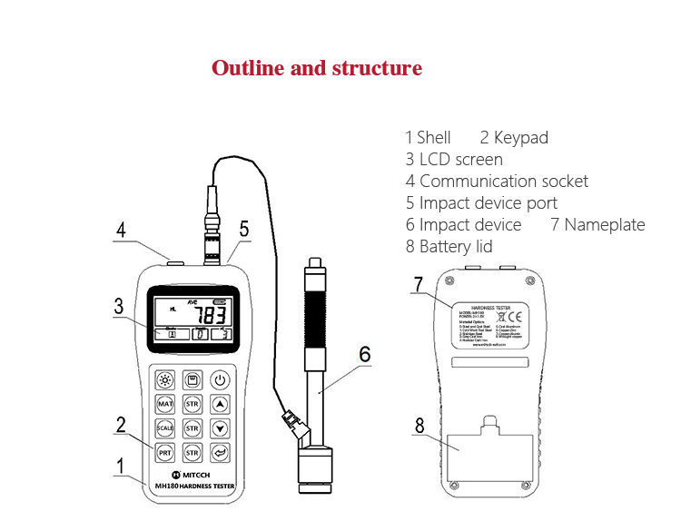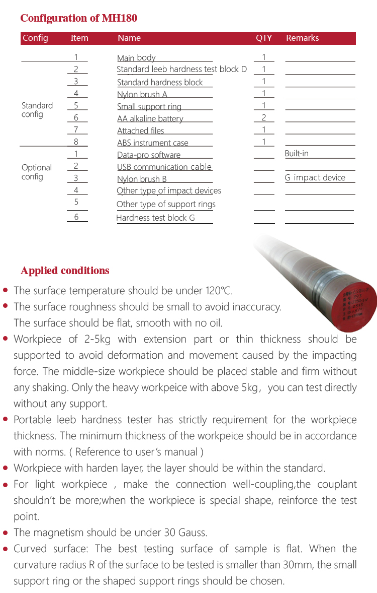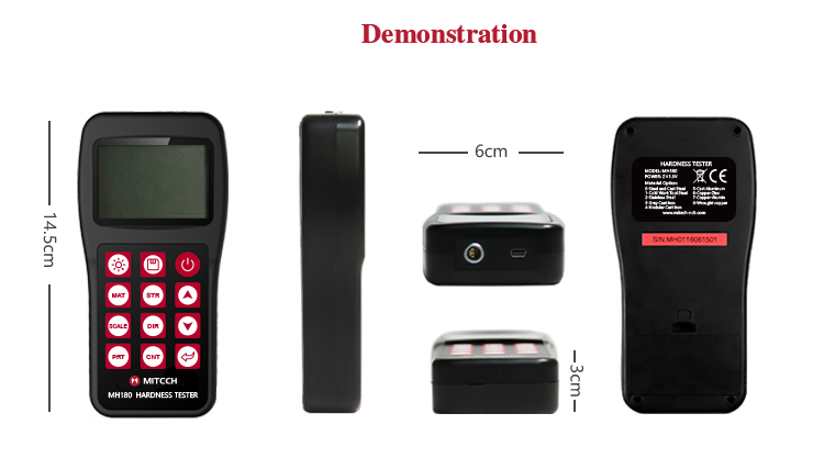 Product OverviewMH180 portable Leeb hardness tester, based on Leeb hardness measuring principle, quick and easy,on-site test the hardness of series metal materials, support free conversion between Leeb, Brinell, Rockwell hardness scale and others,It uses high-contrast segment LCD to display , small size, light,portable, stable and reliable performance.It is widely used in failure analysis of metal processing and manufacturing, special equipment, permanent assembly, inspection and other fields.It can meet the regular hardness testing of industrial production , quality and cheap, which is the first choice for practical and economical models.