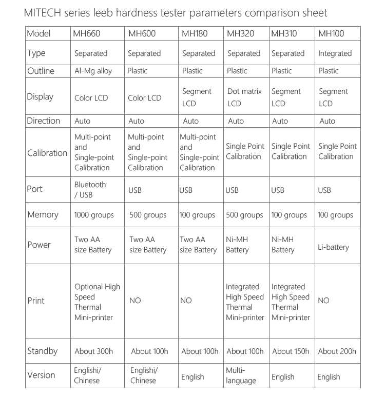 | Mitech portable Leeb hardness testers,with low-power consumption design and long standby, MH180/MH200/MH600/MH660 all adopt two AA size alkaline batteries for power supply. | |