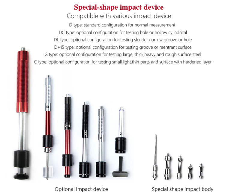| Portable hardness tester G type impact device, height: 255mm Weight: 250g Diameter: 30mm. Built-in G-type impact device, G-type impact body and G-type ball is larger than the other impact body, the impact force is about 9 times of the D-type ball. the impact is heavier, has low requirement to the surface . Applied to the casting and forging with weight of more than 15kg, the thickness of 10mm or more, more than 1.2mm hardened layer, larger and rougher surface. Main applications:car chassis hardness testing;the installed machinery and permanently assembled parts;rapid testing in large range and multi-measuring areas for large-scale work piece;failure analysis of pressure vessel, steam generator and other equipment;bearings and other parts;material identification in the warehouse of metallic materials;heat treatment workpiece of quality control; It can realize the precise measurements of Leeb, Brinell, Rockwell and others. |