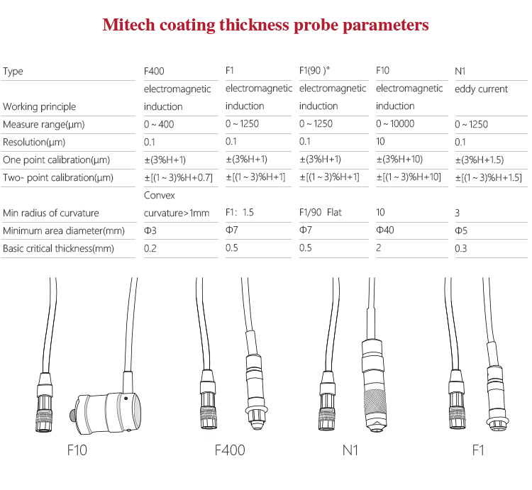 | F10 probe is made based on the magnetic induction principle and should be used for non-magnetic coatings such as aluminum, chrome, copper, zinc, paint and varnish, enamel, rubber etc., on an iron or steel substrate. F10 probe is optional config. Measuring range (um):0-10000μm; Min curvature of the min area(mm):10mm; Diameter of the min area (mm): Φ40; Critical thickness of substrate (mm):2mm; Probe cable length: 90cm; It is plated with hard chrome, durable, not easy to wear; The error caused by the probe is small, the measured value is accurate; F10 probe is made of metal which can effectively protect the probe, corrosion-resistant and vibration-proof, durable; It is widely used to measure the thickness of non-magnetic coatings such as copper plating, rubber layer and paint layer on the magnetic metal materials such as iron and steel. In the manufacturing and metal processing industry, chemical industry, commodity inspection and other detection areas and material protection in the professional scientific research, it is necessary precision instrument. |