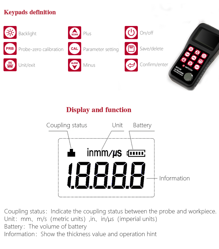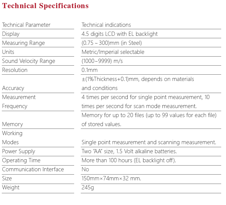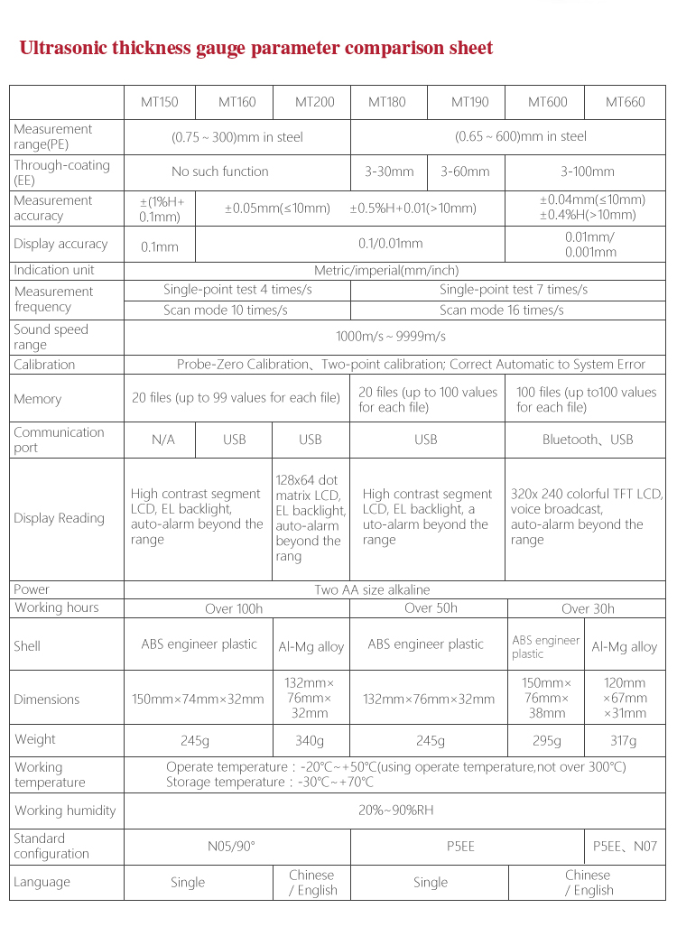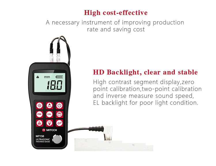 Product OverviewThe model MT150 is a digital ultrasonic thickness gauge. Based on the principle of ultrasonic principle, the instrument is capable of measuring the thickness of various materials, such as metal, plastic, ceramic, glass and many other good ultrasonic conductors. It of all kinds of materials. Compared with the traditional measurement methods, the advantages of ultrasonic thickness gauge is exposed to one side of the workpiece to complete the measurement. Its unique non-destructive testing performance provide the perfect solution for the thickness testing of closed pipes, containers, etc. It is widely used in pertroleum , chemical ,metallurgy, shipbuilding, aviation, aerospace and other fields because of monitoring corrosion thinning degree of various pipes and pressure vessels. It can also be used for precise measurement of sheet metal and machined parts.