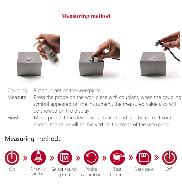 Suitable for measuring metal (such as steel, cast iron, aluminum, copper, etc.) , plastics, ceramics, glass, fiber glass and any other good ultrasonic conductors;