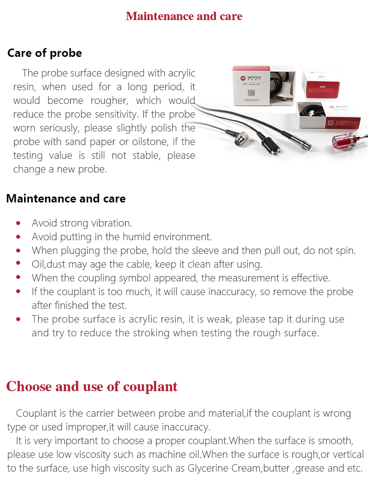 The couplant coated on the probe and the measured workpiece surface as the medium to isolate the air between them, selecting the proper viscosity couplant is the critical thing for the precisely measurement. Mitech series ultrasonic thickness gauge standard 75mm ultrasonic special couplant in the configuration for isolating the air between the ultrasonic probe and the workpiece surface, which can make probe produced ultrasonic wave into the workpiece effectively to ensure the accurate measurement of thickness. The couplant with squeeze bottle packing, it is clean and environmental. It is recommended to select the low viscosity couplant for measuring the smooth material and select the high viscosity couplant (like glycerine cream, butter and so on) for measuring the rough material.