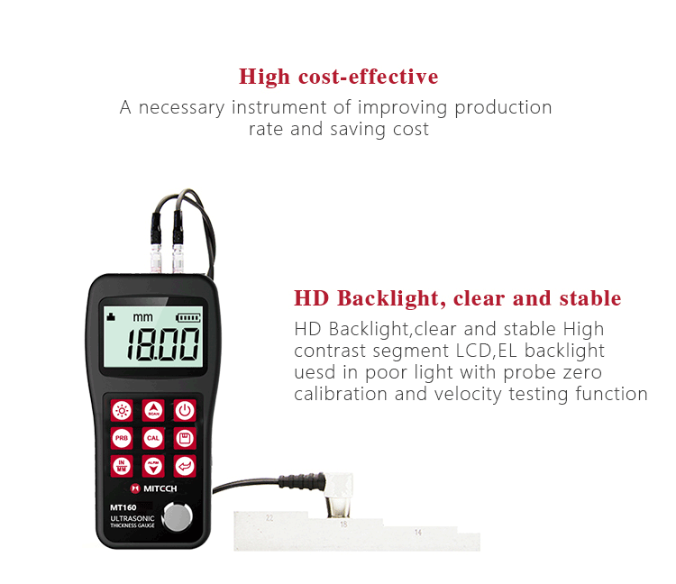 Product OverviewThe model MT160 is a digital ultrasonic thickness gauge .Based on the principle of ultrasonic principle, the instrument is capable of measuring the thickness of various materials, such as metal, plastic, ceramic, glass and many other good ultrasonic conductors. It of all kinds of materials. Compared with the traditional measurement methods, the advantages of ultrasonic thickness gauge is exposed to one side of the workpiece to complete the measurement. Its unique non-destructive testing performance provide the perfect solution for the thickness testing of closed pipes, containers, etc. It is widely used in pertroleum , chemical ,metallurgy, shipbuilding, aviation, aerospace and other fields because of monitoring corrosion thinning degree of various pipes and pressure vessels. It can also be used for precise measurement of sheet metal and machined parts.