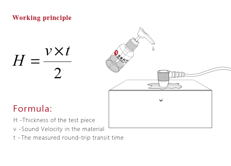 Working PrincipleThe digital ultrasonic thickness gauge determines the thickness of a part or structure by accurately measuring the time required for a short ultrasonic pulse generated by a transducer to travel through the thickness of the material, reflect from the back or inside surface, and be returned to the transducer. The measured two-way transit time is divided by two to account for the down-and-back travel path, and then multiplied by the velocity of sound in the material. The result is expressed in the well-known relationship: H=v×t/2
