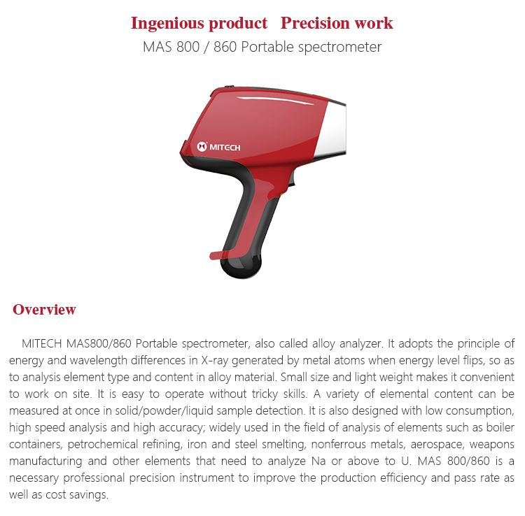 Product OverviewMITECH MAS860 Portable spectrometer, also called alloy analyzer. It adopts the principle of energy and wavelength differences in X-ray generated by metal atoms when energy level flips, so as to analysis element type and content in alloy material. Small size and light weight makes it convenient to work on site. It is easy to operate without tricky skills. A variety of elemental content can be measured at once in solid/powder/liquid sample detection. It is also designed with low consumption, high speed analysis and high accuracy; widely used in the field of analysis of elements such as boiler containers, petrochemical refining, iron and steel smelting, nonferrous metals, aerospace, weapons manufacturing and other elements that need to analyze Na or above to U. MAS 860 is a necessary professional precision instrument to improve the production efficiency and pass rate as well as cost savings.