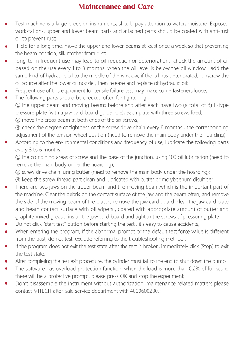 Test machine is a large precision instruments, should pay attention to water, moisture. Exposed workstations, upper and lower beam parts and attached parts should be coated with anti-rust oil to prevent rust;