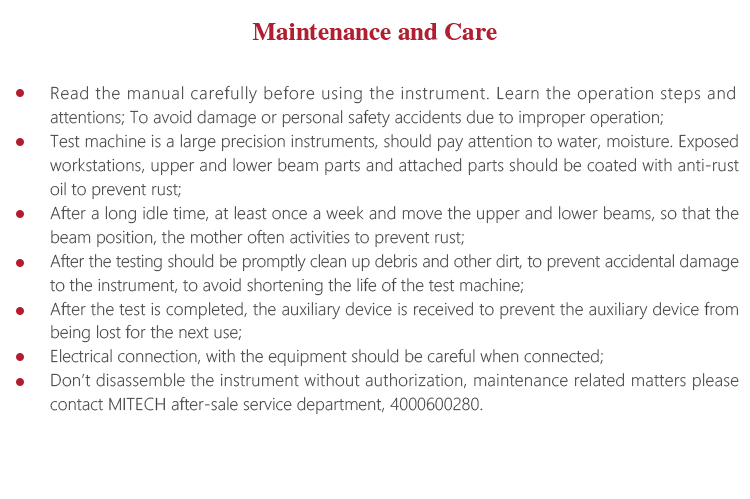 l Test machine is a large precision instruments, should pay attention to water, moisture. Exposed workstations, upper and lower beam parts and attached parts should be coated with anti-rust oil to prevent rust;