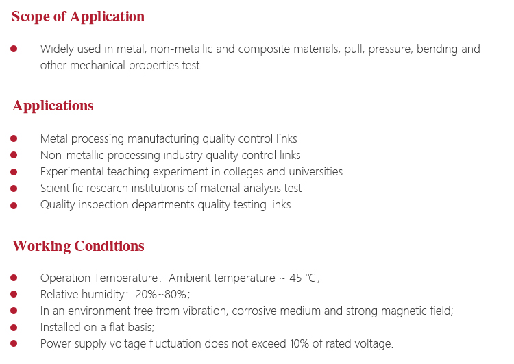 Function & applicationWidely used in metal, non-metallic and composite materials, pull, pressure, bending and other mechanical properties test.