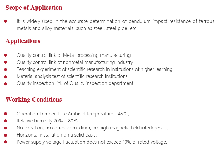 Function & applicationIt is widely used in the accurate determination of pendulum impact resistance of ferrous metals and alloy materials, such as steel, steel pipe, etc..