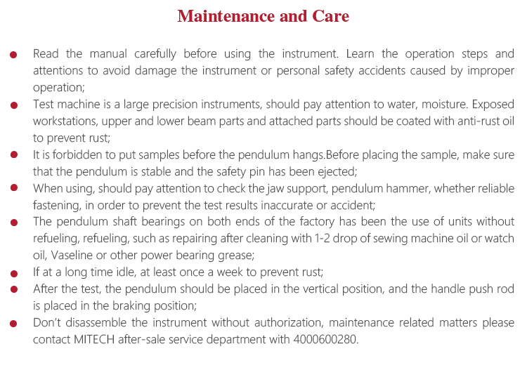 l After the test, the pendulum should be placed in the vertical position, and the handle push rod is placed in the braking