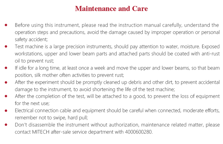 l Test machine is a large precision instruments, should pay attention to water, moisture. Exposed workstations, upper and lower beam parts and attached parts should be coated with anti-rust oil to prevent rust;