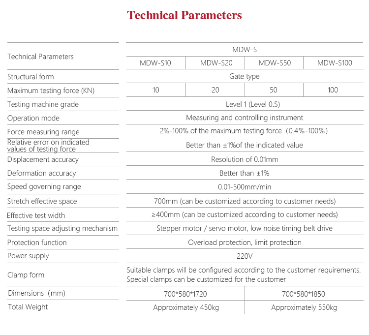 Product OverviewMitech MDW-S digital display series gate type electronic universal testing machine,through the single-chip automatic control motor driving screw movement, equipped with the corresponding auxiliary for metal, non-metallic and composite materials for pull, pressure, bending and other mechanical properties test.( The tensile test is carried out between the upper beam of the main body and the moving beam, and the compression and bending tests are carried out between the main plate and the moving beam. ),it use of built-in controller, AC servo motor, automatic control and data acquisition system, stable performance, strong structure, high reliability, simple operation, high degree of automation. Widely used in metal and non-metallic processing industry, quality inspection departments quality testing, scientific research and other areas of higher education institutions, is to improve production efficiency and save production costs necessary professional precision testing equipment.
