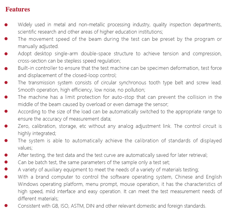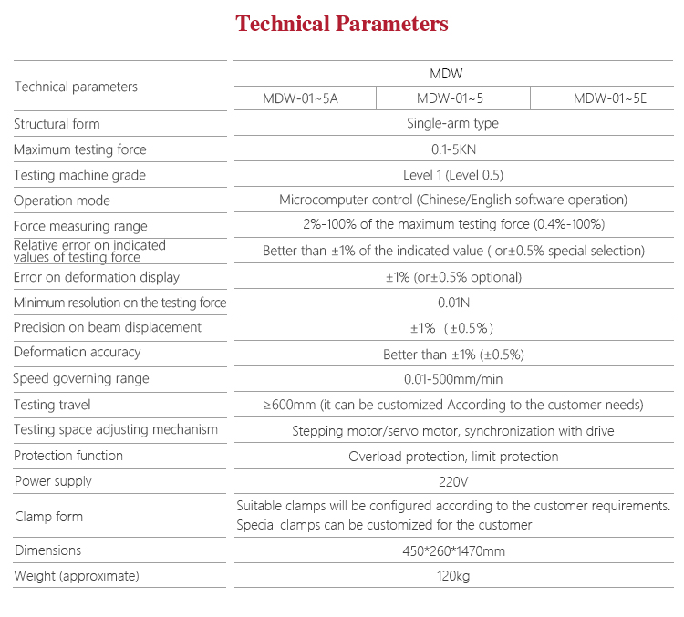 Product OverviewMitech MDW micro control series single-arm electronic tensile testing machine, through the computer control motor drive screw, equipped with the corresponding auxiliary for metal, non-metallic and composite materials for pull, pressure, bending and other mechanical properties test (Tensile test carried out between the upper beam of the main body and the moving beam. Compression and bending tests carried out between the table of the host and the moving beam). It’s adopts the built-in controller, AC servo motor, by computer-aided means to achieve powerful function with stable performance, strong structure, high reliability, simple operation, high degree of automation. It’s widely used in metal and non-metallic processing industry, quality inspection departments, scientific research and other areas of higher education institutions and it’s a necessary professional precision testing equipment for improve production efficiency and save production costs.