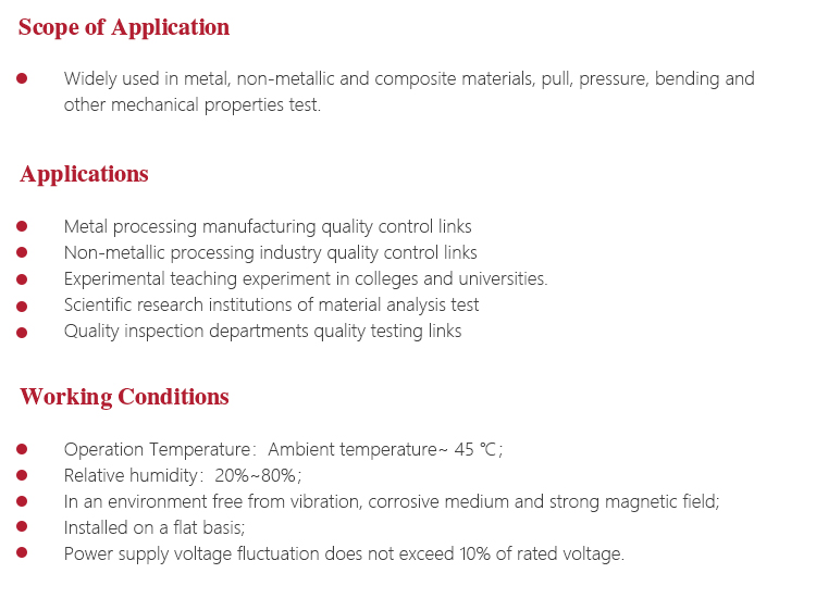 l Test machine is a large precision instruments, should pay attention to water, moisture. Exposed workstations, upper and lower beam parts and attached parts should be coated with anti-rust oil to prevent rust;