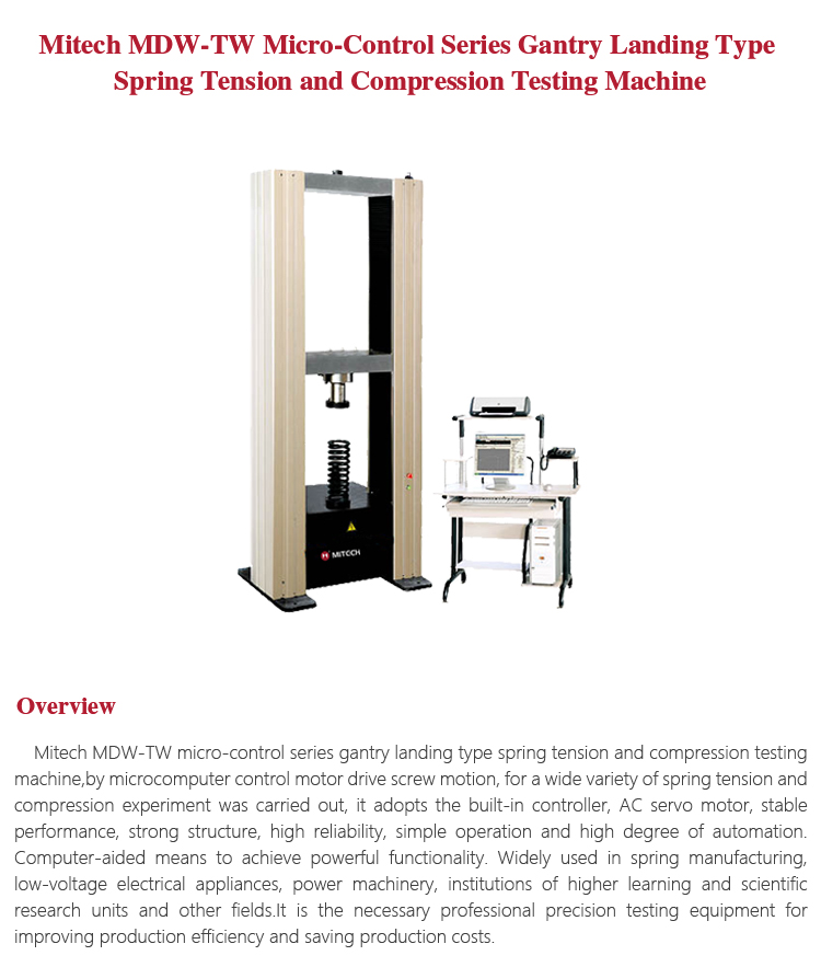 Product OverviewMitech MDW-TW micro-control series gantry landing type spring tension and compression testing machine,by microcomputer control motor drive screw motion, for a wide variety of spring tension and compression experiment was carried out, it adopts the built-in controller, AC servo motor, stable performance, strong structure, high reliability, simple operation and high degree of automation. Computer-aided means to achieve powerful functionality. Widely used in spring manufacturing, low-voltage electrical appliances, power machinery, institutions of higher learning and scientific research units and other fields.It is the necessary professional precision testing equipment for improving production efficiency and saving production costs.