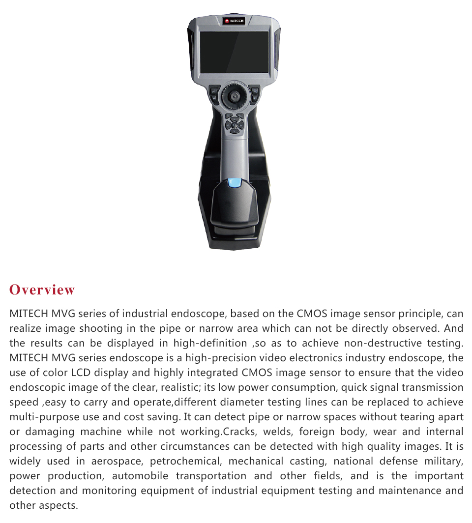 Product OverviewMITECH MVG series of industrial endoscope, based on the CMOS image sensor principle, can realize image shooting in the pipe or narrow area which can not be directly observed. And the results can be displayed in high-definition ,so as to achieve non-destructive testing. MITECH MVG series endoscope is a high-precision video electronics industry endoscope, the use of color LCD display and highly integrated CMOS image sensor to ensure that the video endoscopic image of the clear, realistic; its low power consumption, quick signal transmission speed ,easy to carry and operate,different diameter testing lines can be replaced to achieve multi-purpose use and cost saving. It can detect pipe or narrow spaces without tearing apart or damaging machine while not working.Cracks, welds, foreign body, wear and internal processing of parts and other circumstances can be detected with high quality images. It is widely used in aerospace, petrochemical, mechanical casting, national defense military, power production, automobile transportation and other fields, and is the important detection and monitoring equipment of industrial equipment testing and maintenance and other aspects.