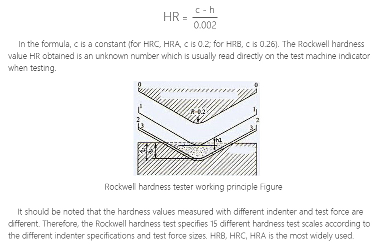 In the formula, c is a constant (for HRC, HRA, c is 0.2; for HRB, c is 0.26). The Rockwell hardness value HR obtained is an unknown number which is usually read directly on the test machine indicator when testing.