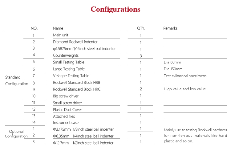 | Hardness Measuring range | HRA:20-88、HRB:20-100、HRC:20-70、HRD:40-77、HRE:70-100、 HRF:60-100、HRG:30-94、HRH:80-100、HRK:40-100 |