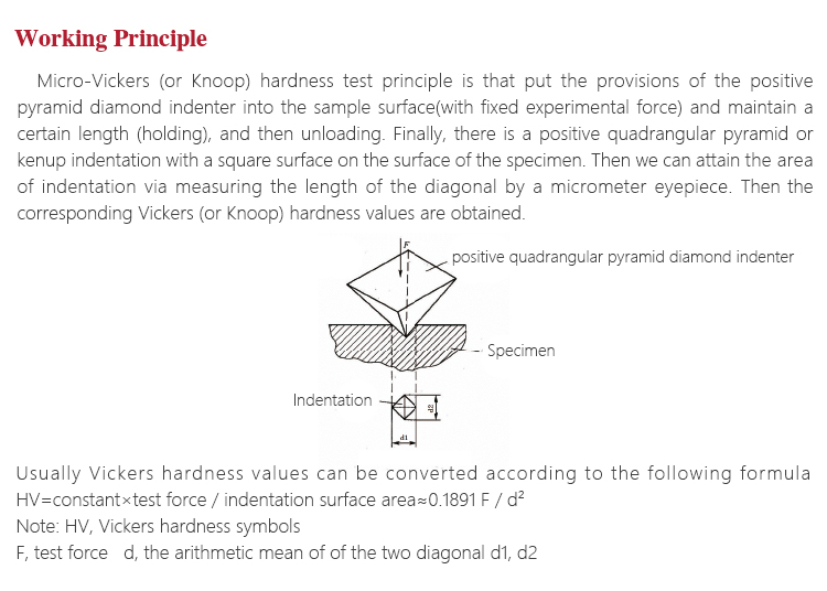 Working PrincipleMicro-Vickers (or Knoop) hardness test principle is that put the provisions of the positive pyramid diamond indenter into the sample surface(with fixed experimental force) and maintain a certain length (holding), and then unloading. Finally, there is a positive quadrangular pyramid or kenup indentation with a square surface on the surface of the specimen. Then we can attain the area of indentation via measuring the length of the diagonal by a micrometer eyepiece. Then the corresponding Vickers (or Knoop) hardness values are obtained.