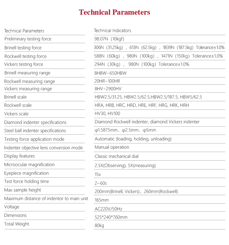 | Vickers testing force | 294N(30kg), 980N(100kg)Tolerance±1.0% |