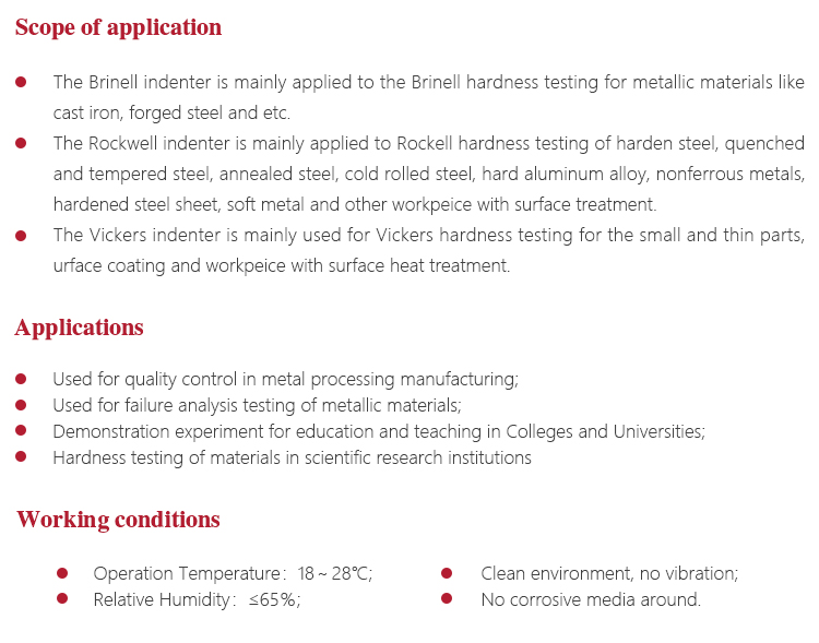 Instrument Featuresl Equipped with Brinell, Rockwell, Vickers three hardness test indenter, full-featured, widely used that can meet a variety of hardness testing needs of metal and non-metallic materials;