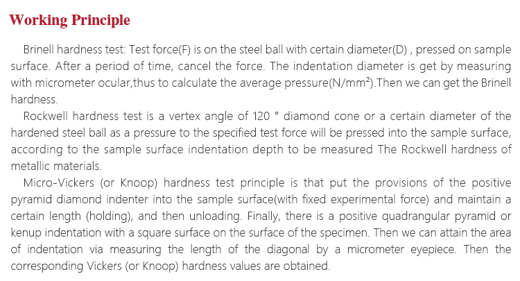 Working PrincipleBrinell hardness test: Test force(F) is on the steel ball with certain diameter(D) , pressed on sample surface. After a period of time, cancel the force. The indentation diameter is get by measuring with micrometer ocular,thus to calculate the average pressure(N/mm2).Then we can get the Brinell hardness.