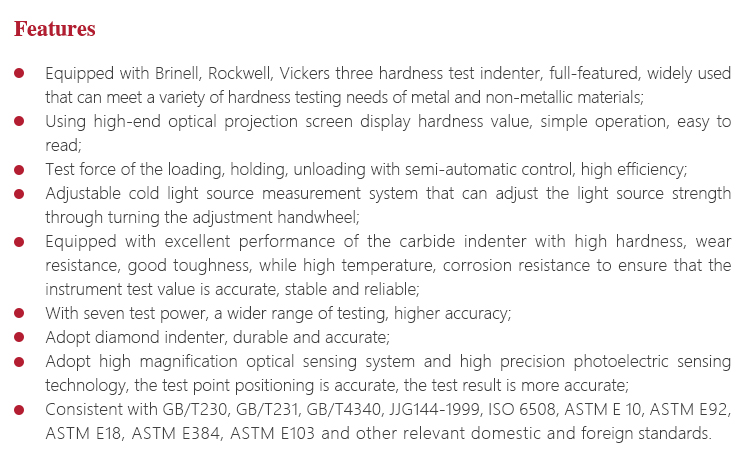Instrument Featuresl Equipped with Brinell, Rockwell, Vickers three hardness test indenter, full-featured, widely used that can meet a variety of hardness testing needs of metal and non-metallic materials;