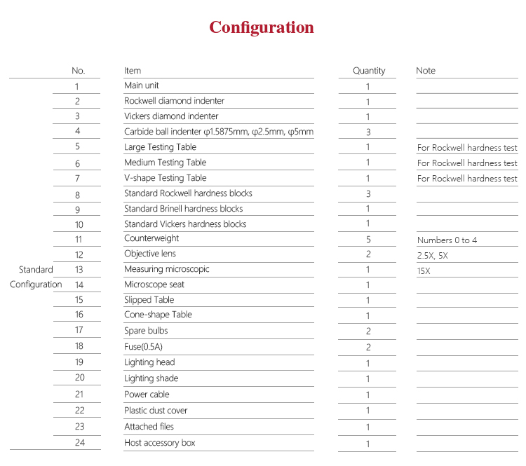 | Vickers testing force | 294N(30kg), 980N(100kg)Tolerance±1.0% |