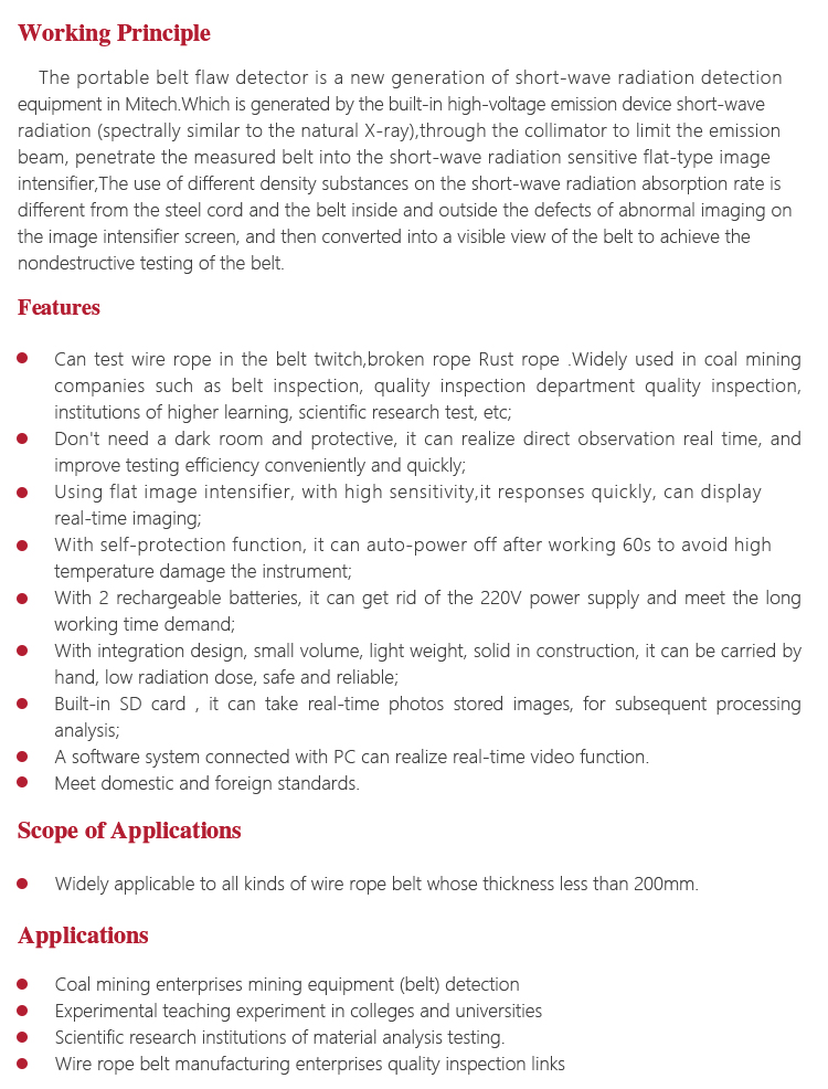 The portable belt flaw detector is a new generation of short-wave radiation detection equipment in Mitech.Which is generated by the built-in high-voltage emission device short-wave radiation (spectrally similar to the natural X-ray),through the collimator to limit the emission beam, penetrate the measured belt into the short-wave radiation sensitive flat-type image intensifier,The use of different density substances on the short-wave radiation absorption rate is different from the steel cord and the belt inside and outside the defects of abnormal imaging on the image intensifier screen, and then converted into a visible view of the belt to achieve the nondestructive testing of the belt.