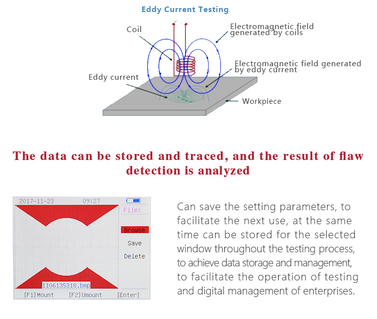 Working PrincipleThe eddy current detection technique is based on the principle of electromagnetic induction, and the excitation signal is loaded into the probe coil. When the probe is close to the metal surface, the alternating magnetic field around the coil will generate the induced current on the metal surface.For flat metal, the flow of induced current is a coil concentric circular, shaped like a vortex, named as the eddy current.The size, phase and flow pattern of the eddy current are affected by the conductivity of the specimen.The eddy current also produces a magnetic field that in turn causes the impedance of the detection coil to change.So when the conductor surface or near the surface of the defect or the measurement of metal materials change, the intensity and distribution of eddy currents will be affected by changes in the impact,Which in turn causes a change in the detection coil voltage and impedance.Eddy current testing is based on this change, the indirect feedback of the existence of defects within the conductor and the performance of metal materials have changed.