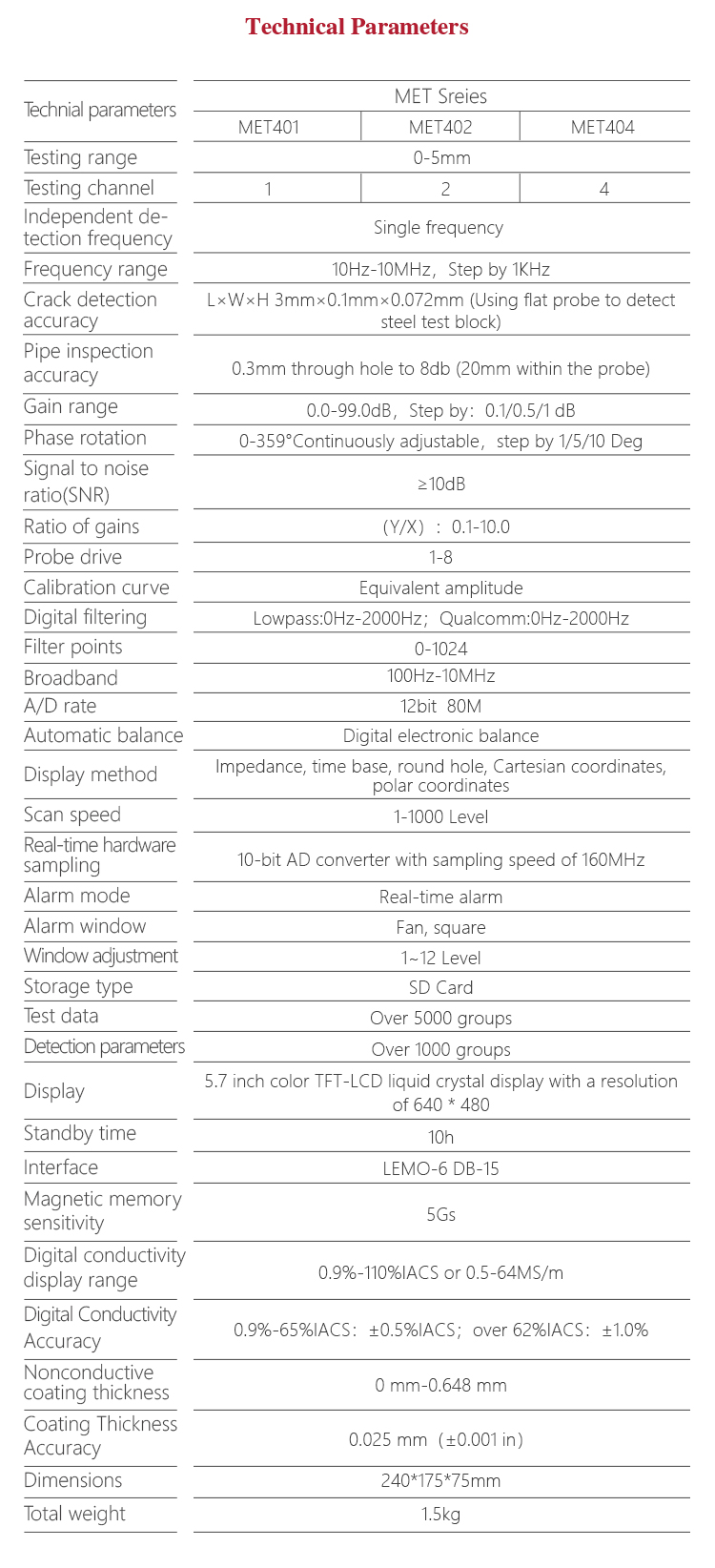 Product OverviewMitech MET Series Portable Eddy Current Flaw Detector,also known as digital electromagnetic detecor,based on the principle of electromagnetic induction,can detect various metal parts surface or near surface defects with high-speed. It uses advanced DSP digital processing and FPGA technology innovation designed, with 5.7-inch TFT LCD screen, can clearly display the detection data.The product has high sensitivity, stable performance, multi-channel simultaneous detection and intelligent data analysis, can be equipped with intelligent probe, can also be customized probe according to customer needs , with extended magnetic memory, coating thickness, conductivity measurement and other practical Features. It is widely used in all kinds of metal pipe rods, auto parts, bearings, oil casing, oil control rods, ring metal parts in non-destructive testing and scientific research and other areas of higher education research.It is the necessary professional precision testing equipment to improve production efficiency, saving production costs.