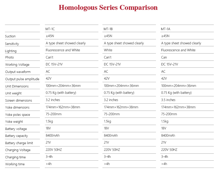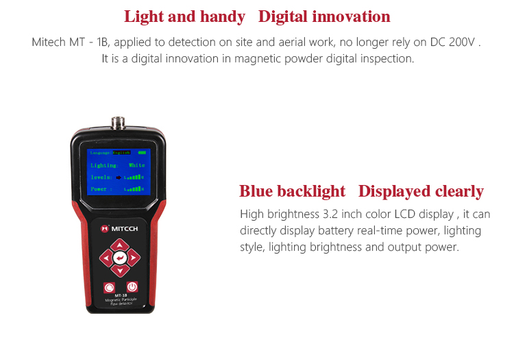 Product OverviewMT-1B magnetic particle flaw detector adapts high-capacity lithium battery pack, converse DC to AC through variable-frequency, providing magnetic powder flaw detector with magnetic power supply. With low power consumption, it can continuous work more than four hour after charging. It especially suits for working in the wild and aerial area.