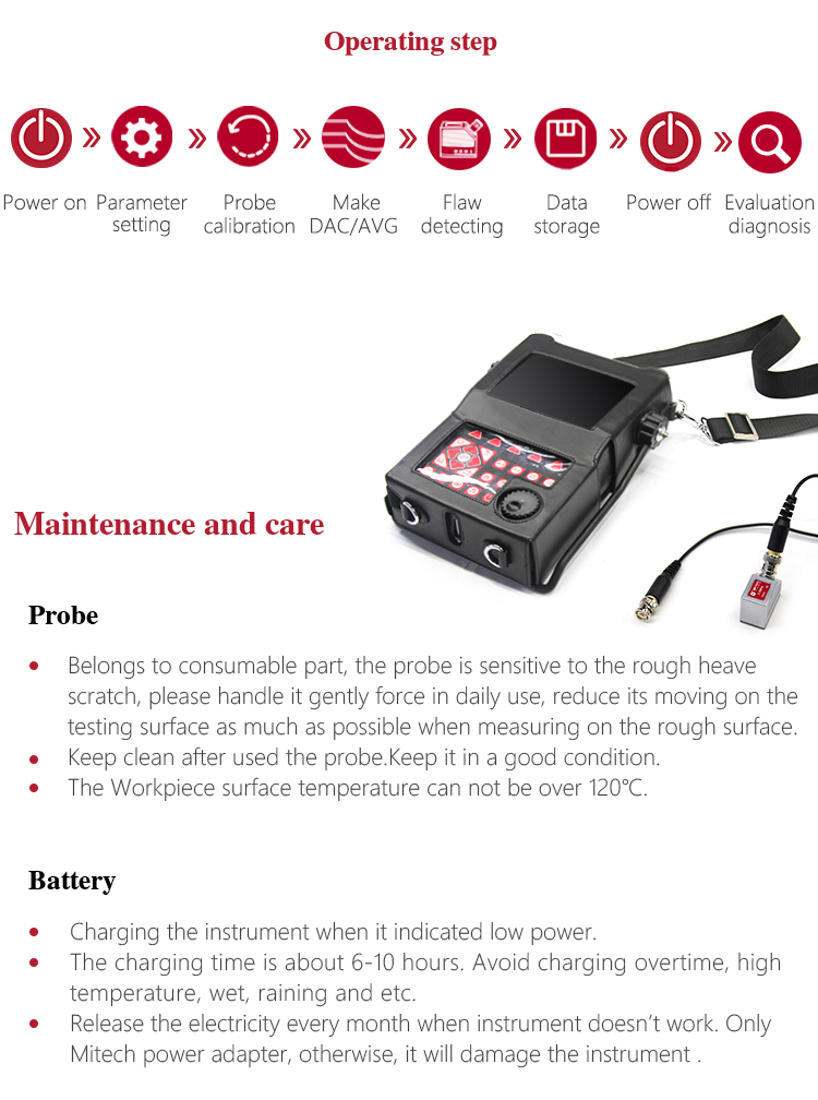 | The battery for B series ultrasonic flaw detector is the rechargeable Li-ion battery pack rated 7.2V at 8800 mAh, which belongs to the standard configuration for Mitech B series ultrasonic flaw detectors. During using, please don’t disassemble the battery pack by yourself and use only with our special power adaptor for charging. Otherwise, it will cause damage to the battery and instrument. If it’s not used for a long time, make sure to do regularly charging and discharging about one time per month to avoid failure. | |