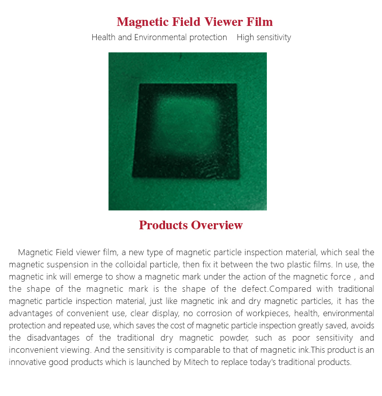 Product OverviewMagnetic Field viewer film, a new type of magnetic particle inspection material, which seal the magnetic suspension in the colloidal particle, then fix it between the two plastic films. In use, the magnetic ink will emerge to show a magnetic mark under the action of the magnetic force , and the shape of the magnetic mark is the shape of the defect.Compared with traditional magnetic particle inspection material, just like magnetic ink and dry magnetic particles, it has the advantages of convenient use, clear display, no corrosion of workpieces, health, environmental protection and repeated use, which saves the cost of magnetic particle inspection greatly saved, avoids the disadvantages of the traditional dry magnetic powder, such as poor sensitivity and inconvenient viewing. And the sensitivity is comparable to that of magnetic ink.This product is an innovative good products which is launched by Mitech to replace today's traditional products.