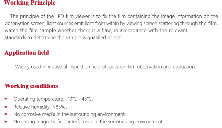 Working PrincipleThe principle of the LED film viewer is to fix the film containing the image information on the observation screen, light sources emit light from within by viewing screen scattering through the film, watch the film sample whether there is a flaw, in accordance with the relevant standards to determine the sample is qualified or not