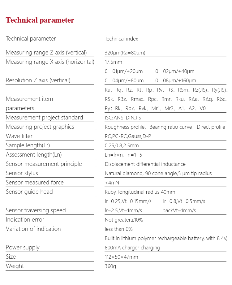 Full accessories, options for curve surface probe, deep groove probe, small hole probe, tiny hole probe, tooth surface probe, small pillar, height adjust platform, extension bar, lateral transfer rod etc.