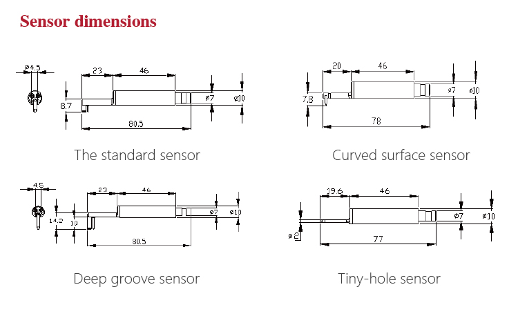 | The tiny-hole sensor of Mitech portable surface roughness tester MR200, with totally length of 77mm, main body length of 46mm, guide-head bearer length of 19.6mm, main body diameter of Φ10mm, core-insert sleeve diameter of Φ7mm, guide-head height of 2mm, It is the optional configuration of the surface roughness tester, mainly used for measuring the inner surface roughness of the circular hole with a diameter larger than 2.5mm. And its other usage is the same as the standard sensor. | |
