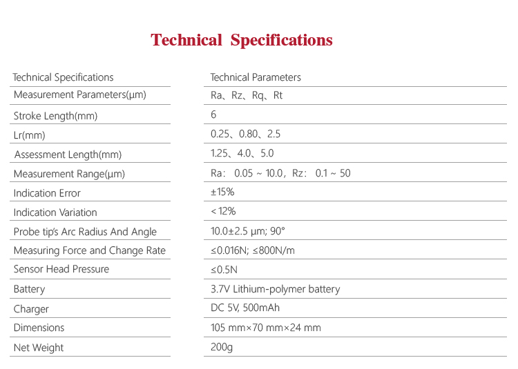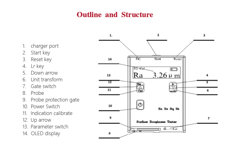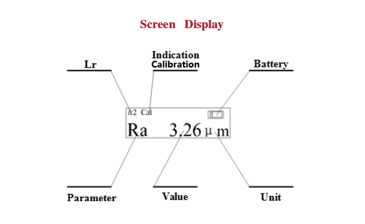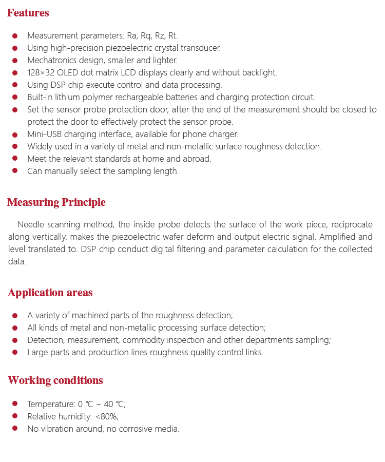 Needle scanning method, start the instrument and do the measurement after placing the instrument on the surface of the work-piece. The inside precision driven component of instrument drive the probe slide straightly along the surface of the workpiece while the probe with its sharp stylus detecting the surface of the workpiece. At the same time the workpeice surface roughness will make the stylus displacement along vertically. This displacement makes the probe piezoelectric wafer deform and output electric signal. After amplified and level translated, this signal will go to the data acquisition system.DSP chip will conduct digital filtering and parameter calculation for the collected data. And the measurement results will be displayed on the OLED display screen.