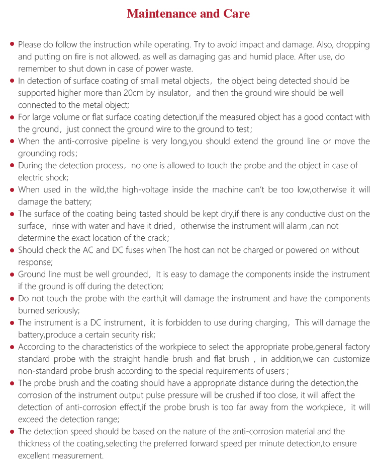 l The surface of the coating being tasted should be kept dry,if there is any conductive dust on the surface,rinse with water and have it dried,otherwise the instrument will alarm ,can not determine the exact location of the crack;