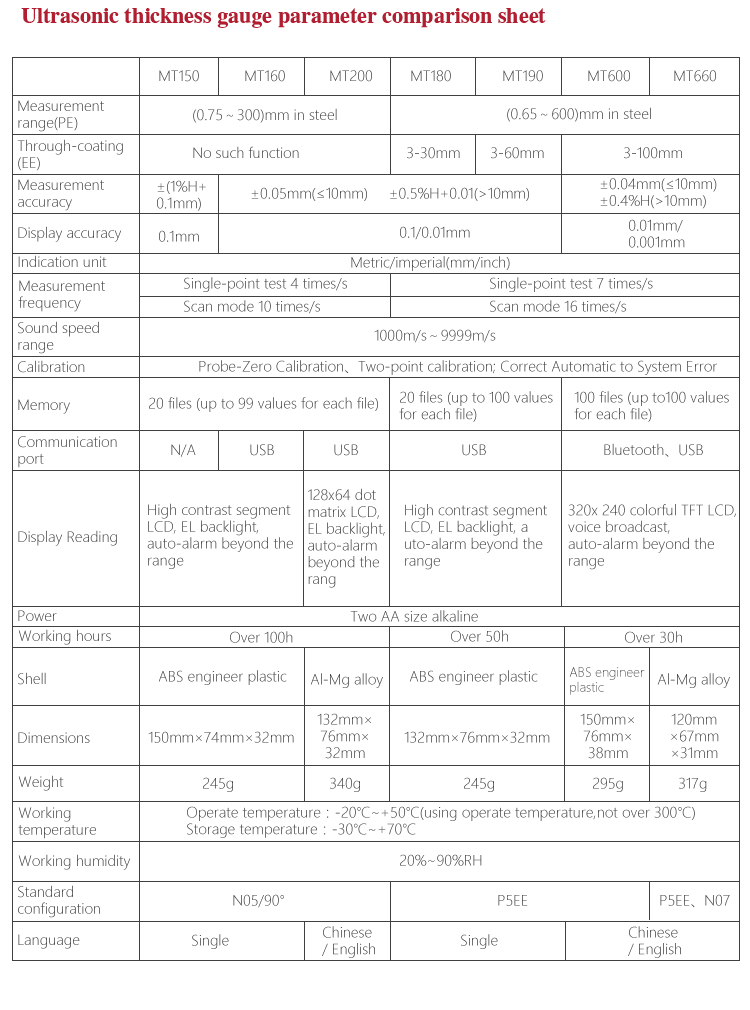 Product OverviewThe model MT160 is a digital ultrasonic thickness gauge .Based on the principle of ultrasonic principle, the instrument is capable of measuring the thickness of various materials, such as metal, plastic, ceramic, glass and many other good ultrasonic conductors. It of all kinds of materials. Compared with the traditional measurement methods, the advantages of ultrasonic thickness gauge is exposed to one side of the workpiece to complete the measurement. Its unique non-destructive testing performance provide the perfect solution for the thickness testing of closed pipes, containers, etc. It is widely used in pertroleum , chemical ,metallurgy, shipbuilding, aviation, aerospace and other fields because of monitoring corrosion thinning degree of various pipes and pressure vessels. It can also be used for precise measurement of sheet metal and machined parts.