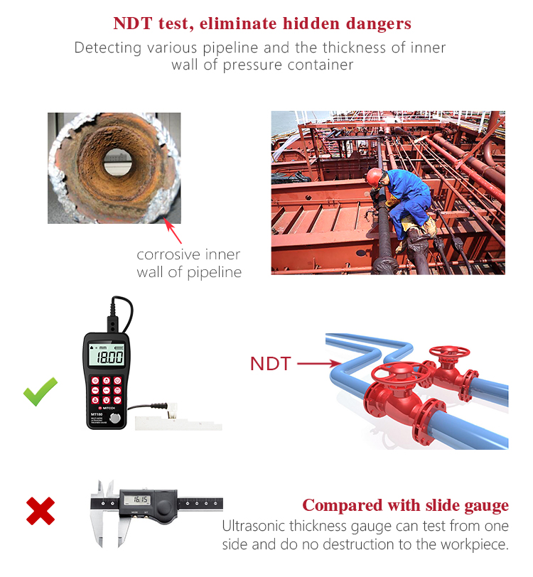 Product OverviewMiteh MT180 multi-mode ultrasonic thickness gauge, based on ultrasonic measuring principle, it can perform thickness measurements on a wide range of materials including metals, plastic, ceramics glass and other ultrasonic well-conductive materials. It is also capable for measuring the sound velocity of the object with known thickness. Compared with the traditional measurement method, the advantage of ultrasonic thickness gauge is that it can finish the measurement only if it contacts with one side of the measured workpiece. Its unique performance of capable for testing thickness through the coating provides efficient solution for testing the workpiece of coated surface or corrosion materials. It can test the workpiece directly without needing to get rid of the surface coating. It’s widely used for monitoring the production equipments’ various pipelines and pressure vessel corrosion reducing degree in the fields of petroleum, chemical, metallurgy, shipbuilding, aviation, aerospace and so on. It also can be used for making accurate measurement to various plates and machining parts. It is the necessary professional precision instrument for improving the production efficiency and qualification rate as well as saving cost.