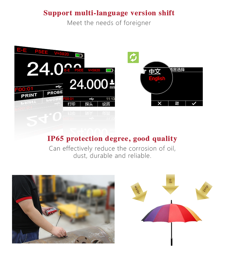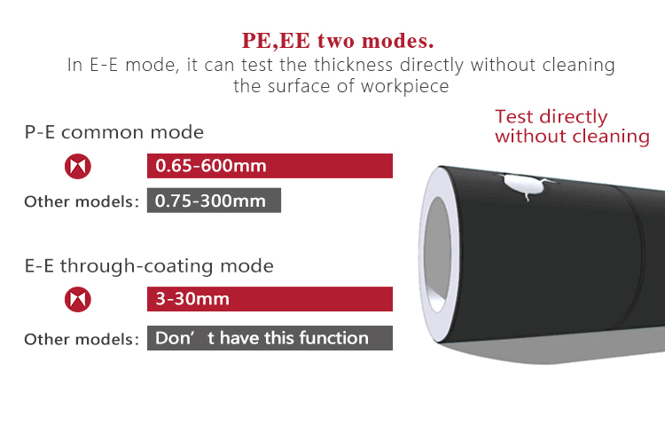 Instrument FeaturesMulti-mode: Pulse-Echo mode (P-E mode) and Echo-Echo mode (E-E mode). In Echo-Echo mode, it can test the wall thickness eliminating paint or coating thickness.
