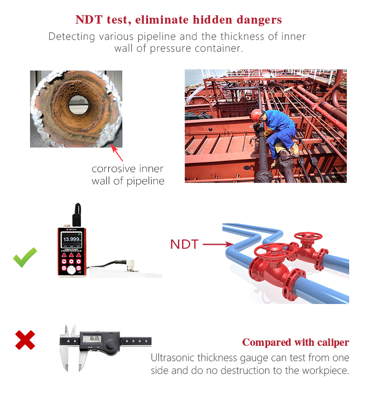 Product OverviewMT660 multi-mode ultrasonic thickness gauge is the newest promoted upgraded product by Mitech. It pays more attention to user experience and functional innovation. Adopted with 320*240 colorful LCD display, it can show you clear measurement result under dim light and strong sunshine environment, improved the visual experience greatly. Sealed aluminum-magnesium alloy case delicate design, smaller volume, better quality are specially designed for defense against oil, dust in the bad sit environment. With intelligent warning function, it will promote automatically when beyond the setting range, it is convenient for reading. It can meet the efficient collecting material’s multiple points’ thickness accurate testing demand. It supports 0.001 high accuracy display and Bluetooth communication. With through coating mode and common mode, its unique performance of capable for testing thickness through the coating provides efficient solution for testing the workpiece of coated surface or corrosion materials. It can measure the workpiece directly without needing to get rid of the surface coating before measurement. It’s widely used for monitoring the production equipments’ various pipelines and pressure vessel corrosion reducing degree in the fields of petroleum, chemical, metallurgy, shipbuilding, aviation, aerospace and so on. It also can be used for making accurate measurement to various plates and machining parts. It is the necessary professional precision instrument for improving the production efficiency and qualification rate as well as saving cost.