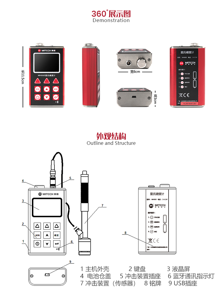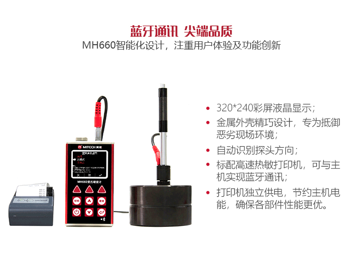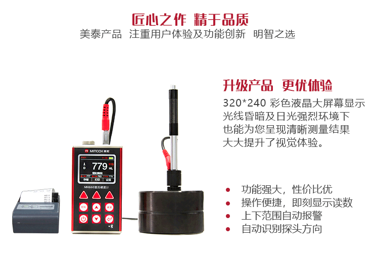 產品概述MH660便攜式里氏硬度計是美泰公司新推出的升級產品,它更加注重用戶體驗及功能創(chuàng)新。采用320×240彩色液晶顯示屏,光線昏暗及日光強烈環(huán)境下也能為您呈現(xiàn)清晰測量結果,大大提升了視覺體驗;密封的金屬外殼精巧設計,體積更小、品質更優(yōu),專為抵御惡劣現(xiàn)場環(huán)境中的油污、粉塵而設計;獨創(chuàng)的多點校準功能,可對轉換曲線進行多點調校,減小測量誤差;測量中儀器可自動識別測量方向,滿足高效采集多角度材料硬度的精準檢測需求,支持多種硬度制氏間的自由轉換;低功耗設計由兩節(jié)AA五號電池供電,可實現(xiàn)藍牙通訊,支持多語言版本切換。被廣泛地應用于金屬加工制造業(yè)、特種設備或永久性組件的在役失效分析、商檢等領域。特別適宜對大型不可拆卸部件的現(xiàn)場硬度測試。是提高生產合格率、節(jié)約成本必備的專業(yè)精密儀器。
