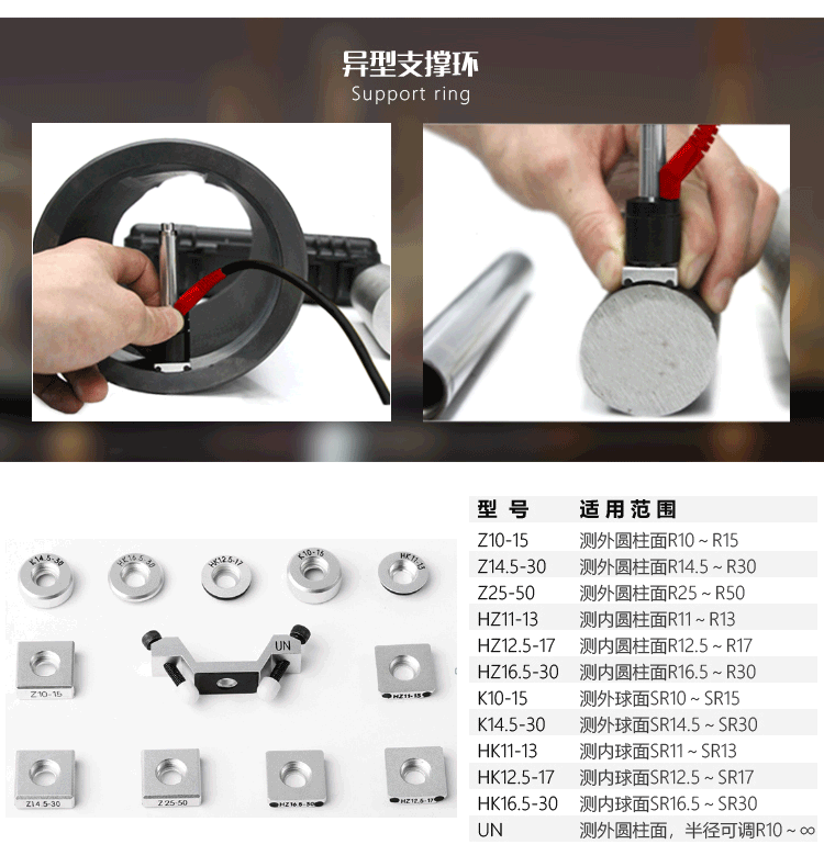 當被測表面曲率半徑R小于30mm的工件在測試時應使用小支承環(huán)或異型支承環(huán)。